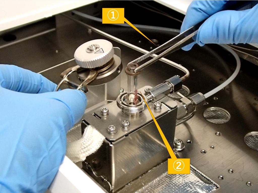 ピンセット(①)を使用して、古いガラスインサート(②)を引き抜きます。