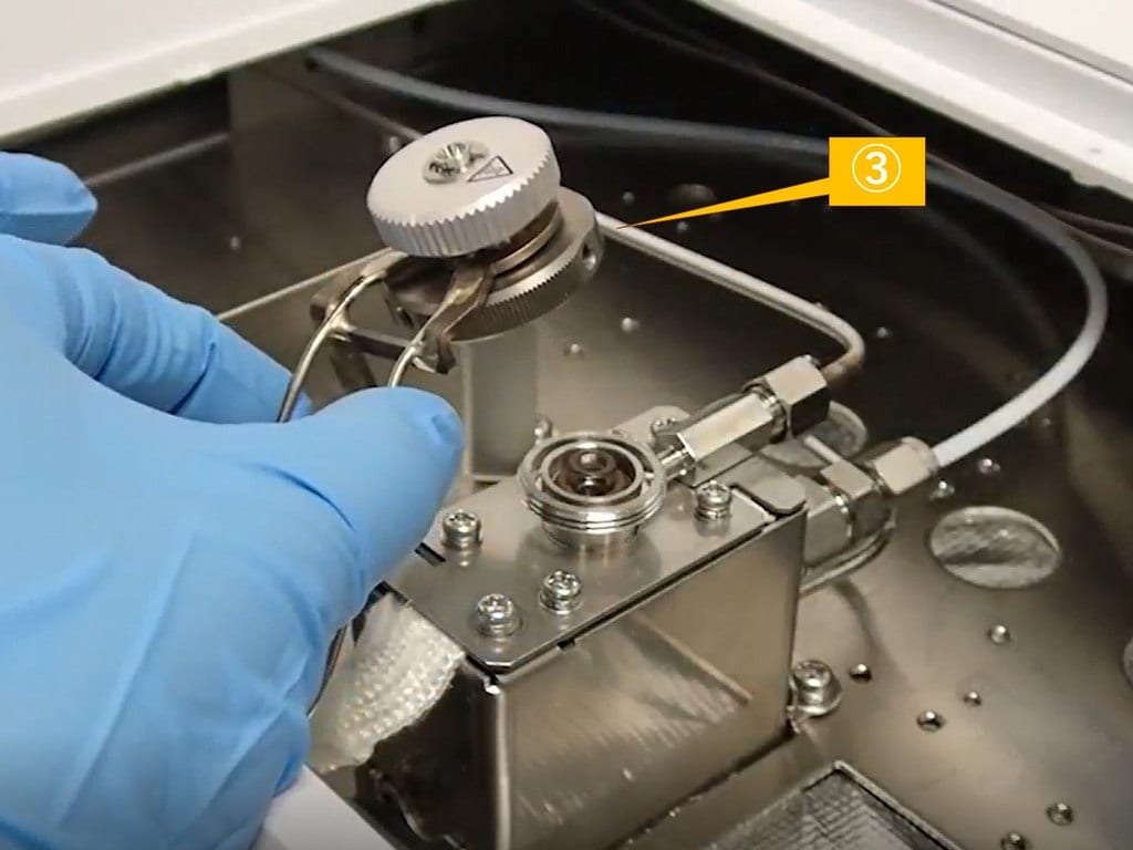 ガラスインサートが破損しないように、インジェクションポートは左手でゆっくりと真上に持ち上げてください。